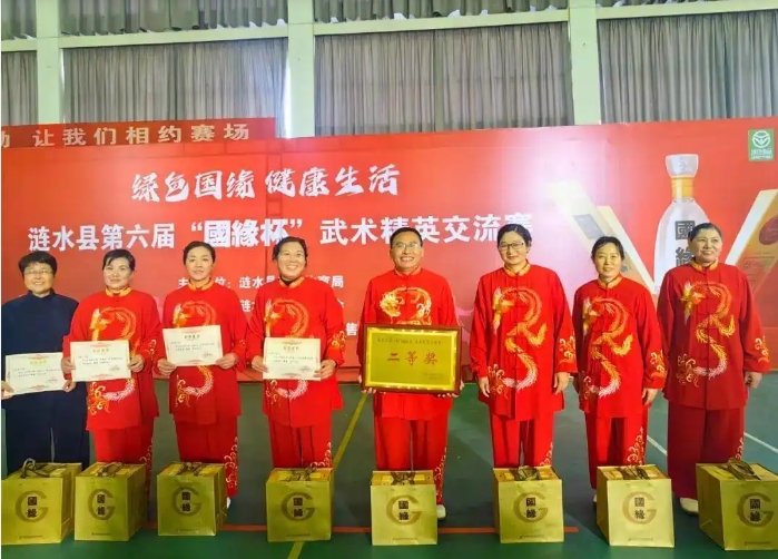 绿色国缘,健康生活。11月30日上午,由涟水县教体局、体育总会主办,县太极拳协会承办,江苏今世缘酒业股份有限公司赞助的涟水县第六届“国缘杯”武术精英交流赛在郑梁梅小学运动馆举办。来自全县不同太极拳健身站点的24支代表队近200名太极拳爱好者同场竞技,切磋交流,最终涟水陈式太极拳健身站、一品梅健身站、五岛湖茶树林健身站等六支代表队分别获得大赛一、二、三等奖。