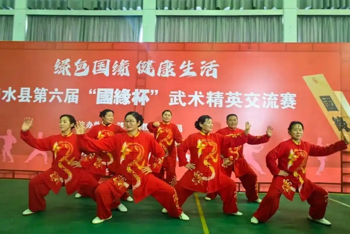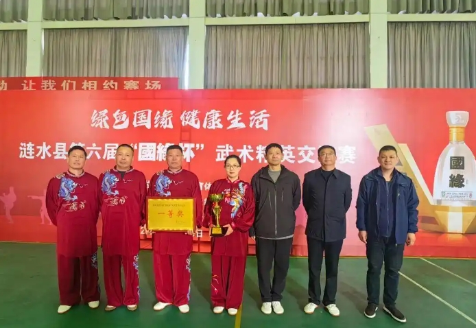 绿色国缘,健康生活。11月30日上午,由涟水县教体局、体育总会主办,县太极拳协会承办,江苏今世缘酒业股份有限公司赞助的涟水县第六届“国缘杯”武术精英交流赛在郑梁梅小学运动馆举办。来自全县不同太极拳健身站点的24支代表队近200名太极拳爱好者同场竞技,切磋交流,最终涟水陈式太极拳健身站、一品梅健身站、五岛湖茶树林健身站等六支代表队分别获得大赛一、二、三等奖。