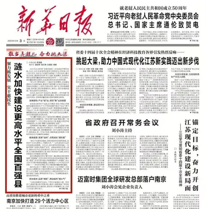 今日,《新华日报》头版头条聚焦涟水,刊发报道《聚力抓发展实干惠民生涟水加快建设更高水平全国百强县》。现将全文转载,以飨读者。
