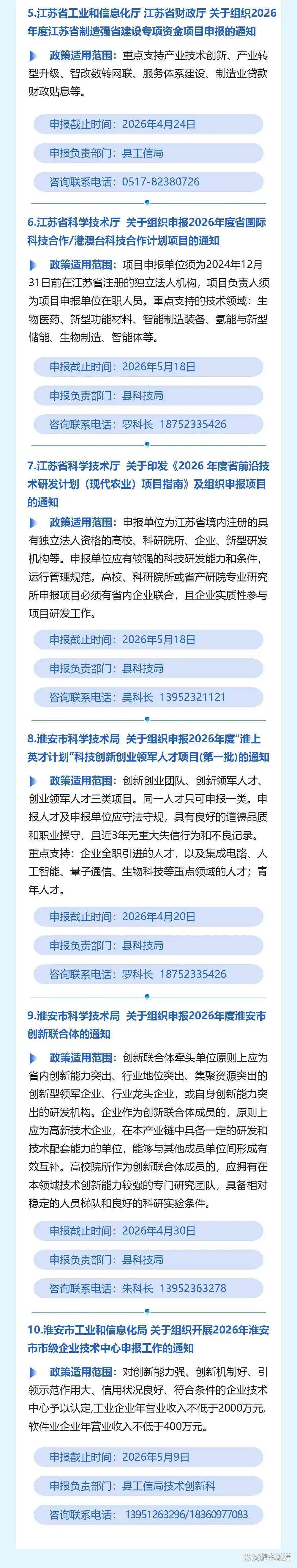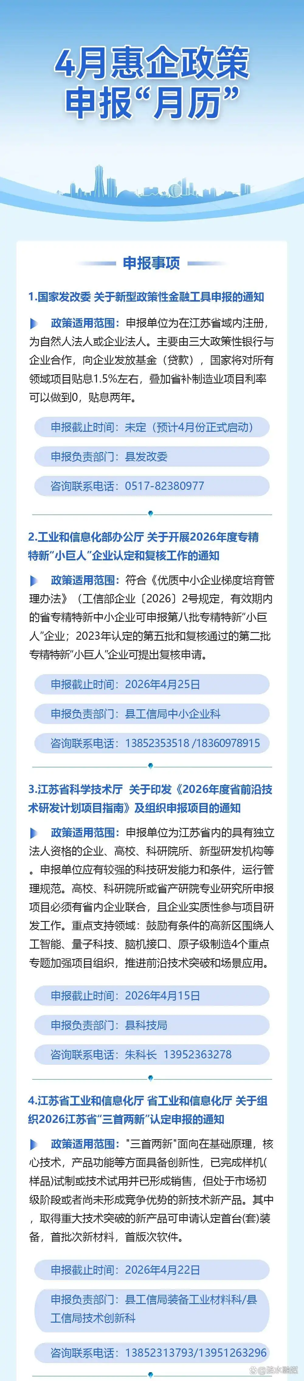 为持续营造一流营商环境、助推企业提质增效高质量发展,2026年,涟水经济开发区积极联动县发改委、工信局、科技局等单位,对各级涉企扶持政策进行整合梳理,创新推出“惠企政策申报月历”。通过按月动态更新、集中统一发布,方便园区企业及时掌握国家、省、市项目申报关键节点,进一步提高政策知晓率和申报成功率,做实做细企业服务保障。